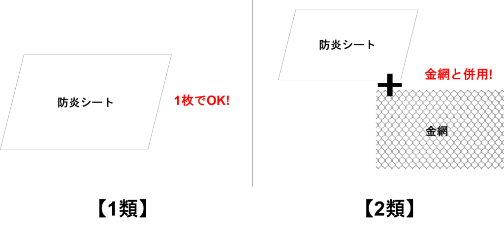 性能区分は JIS A 8952(建築工事用シート)で定められ、その基準にもとづいて「1類」と「2類」に分類されています。