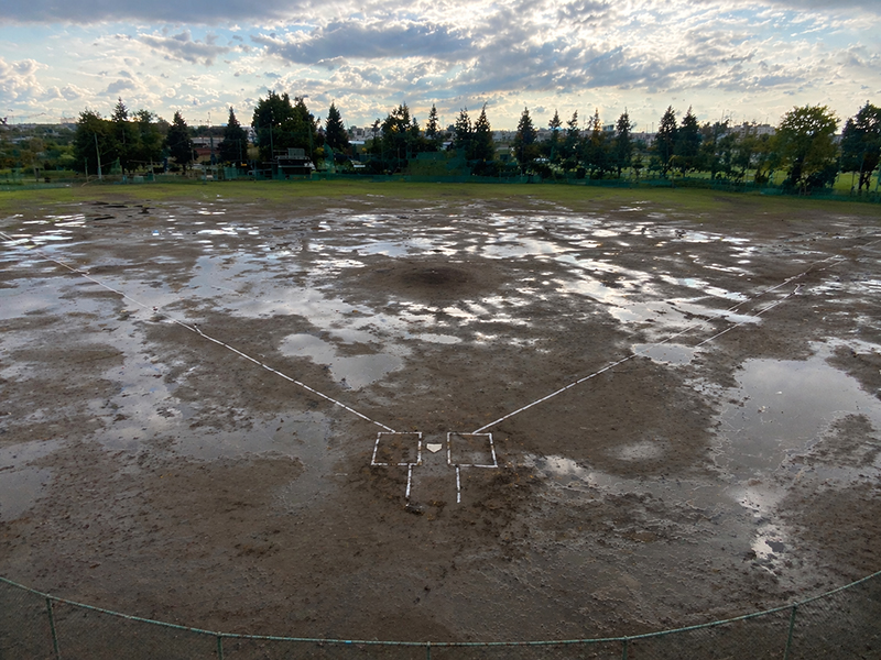 水たまりの除去に時間がかかり、ぬかるみで試合や練習が中止になる。