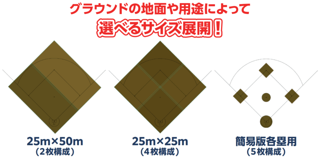 マウンド全体を覆う大判サイズや各塁用など基本的なサイズに加え、それ以外のサイズもオーダーメイドで製作できます。